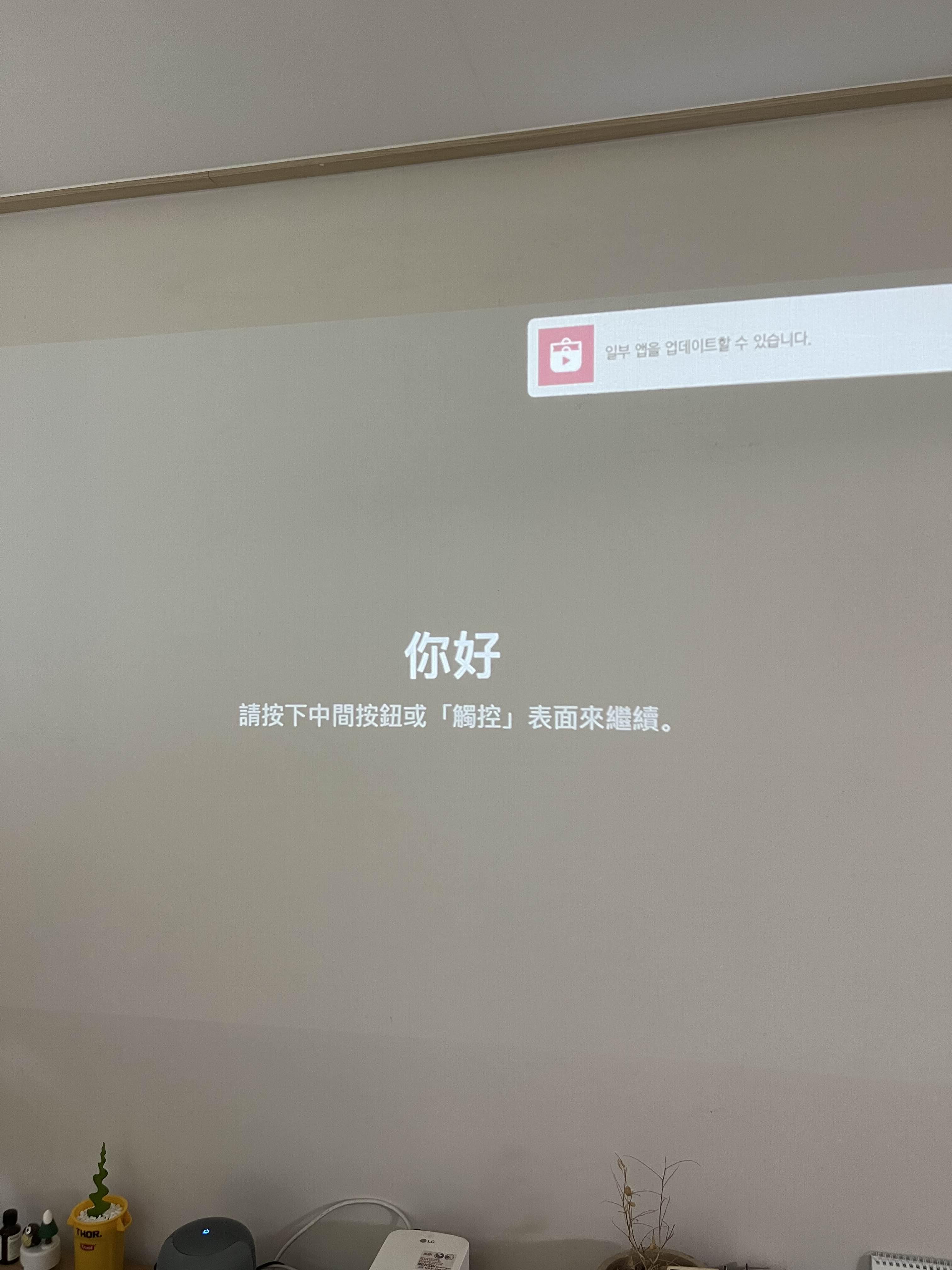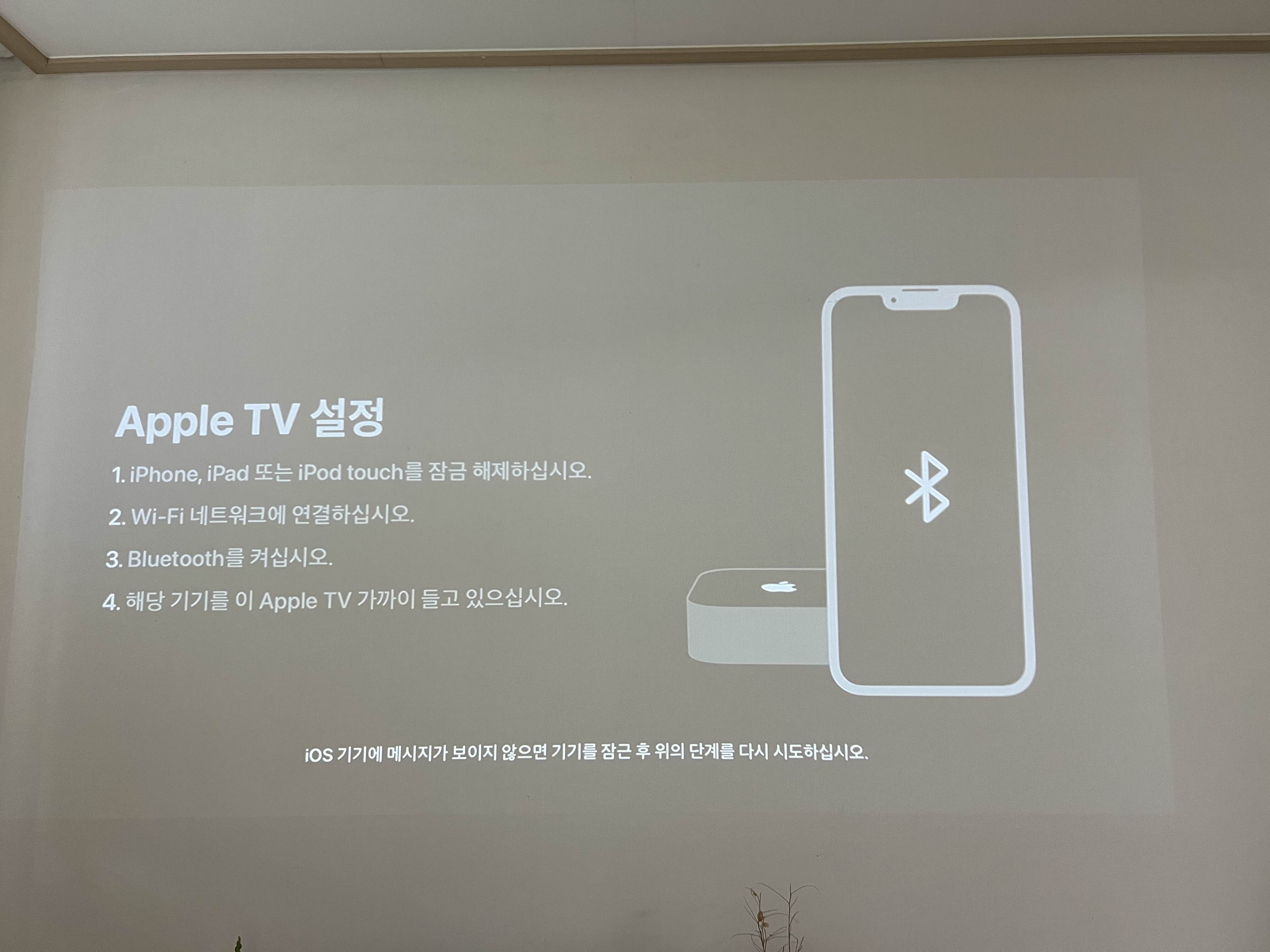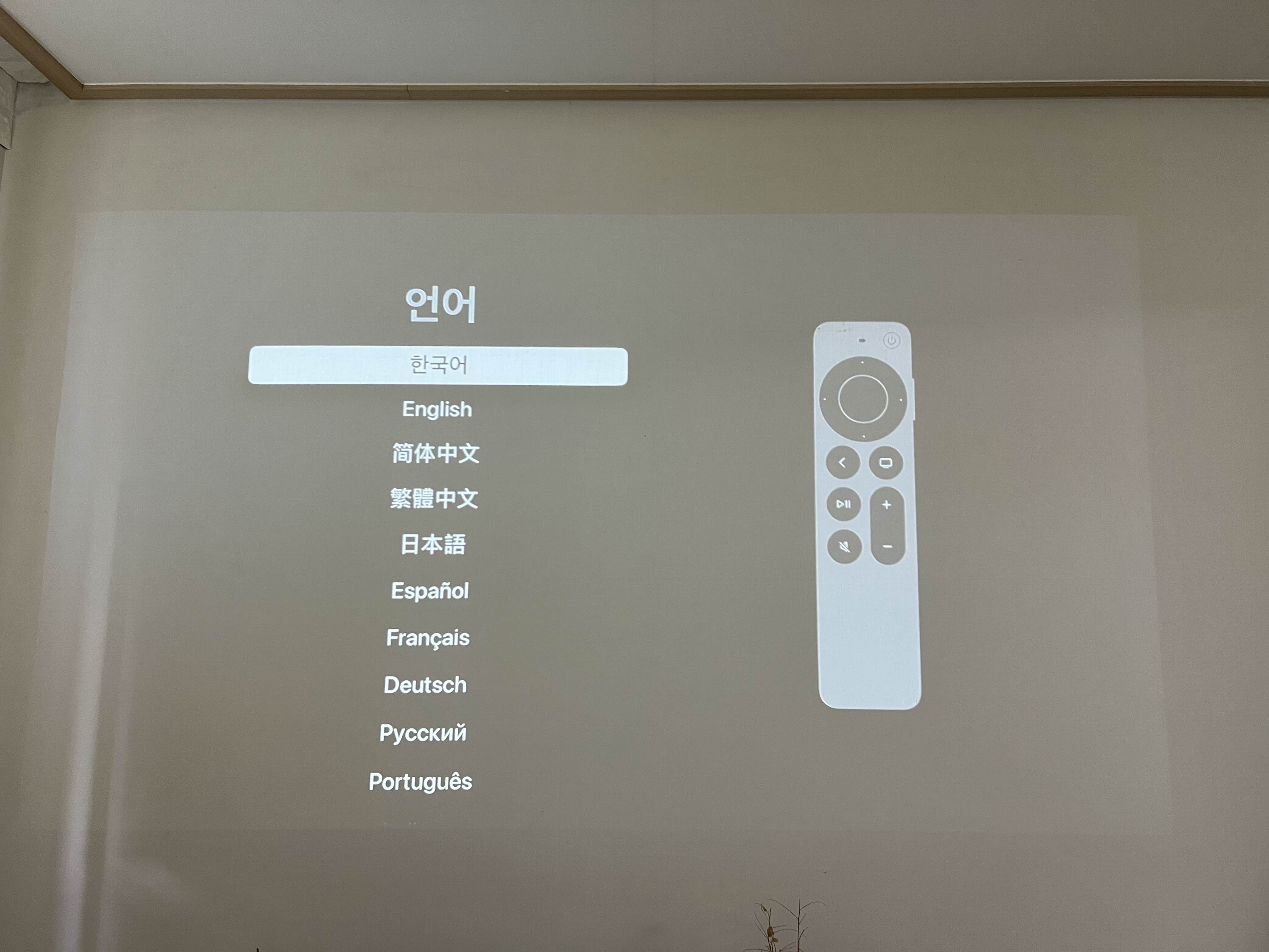 낮에 도착했고 그냥 세팅이라 어둡게 하지 않았습니다. 아무도 자세히 읽어보지 않으셨겠지만, 저희 집에는 TV가 없습니다. 빔에 연결하였습니다. 그래도 유저에게 세팅을 편하게 하기 위해 핸드폰으로 세팅을 넘깁니다. 진짜 어이 없는 제조사는 리모콘으로 하나씩 키보드를 한칸 한칸 이동 시키는데, 이런 점은 애플의 장점이고 제조업 회사를 다니는 사람으로 부럽다. 이런 회사에 다녀야 하는데 능력이 안되네요...