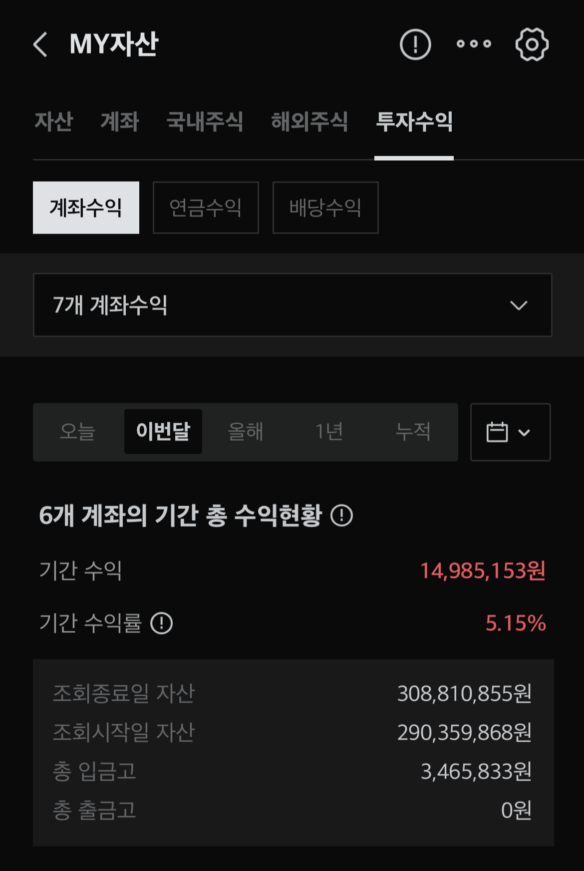 하지만 나스닥이나 코스피가 거의 6% 이상 올랐기 때문에 그리 좋은 수익은 아닌 것 같습니다.