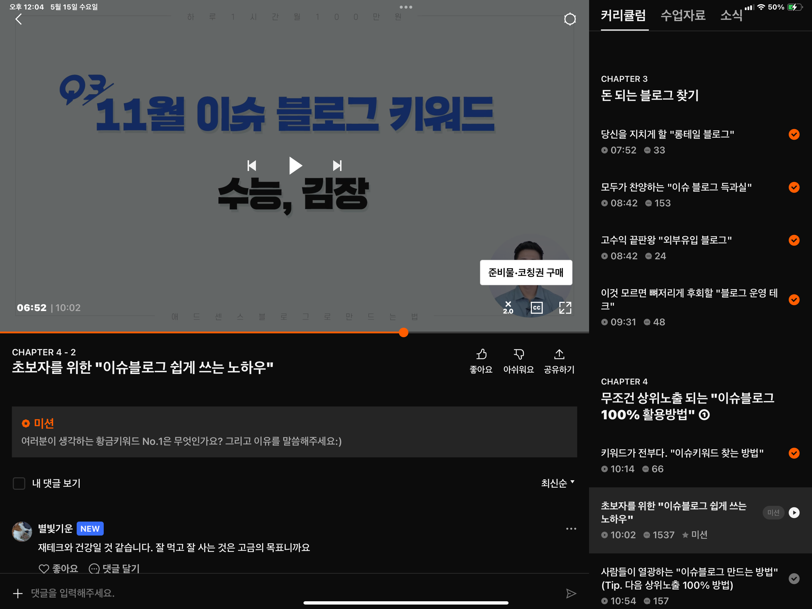 롱테일 블로그를 진행하려고 하기 때문에, 2배속으로 다시 듣겠습니다.