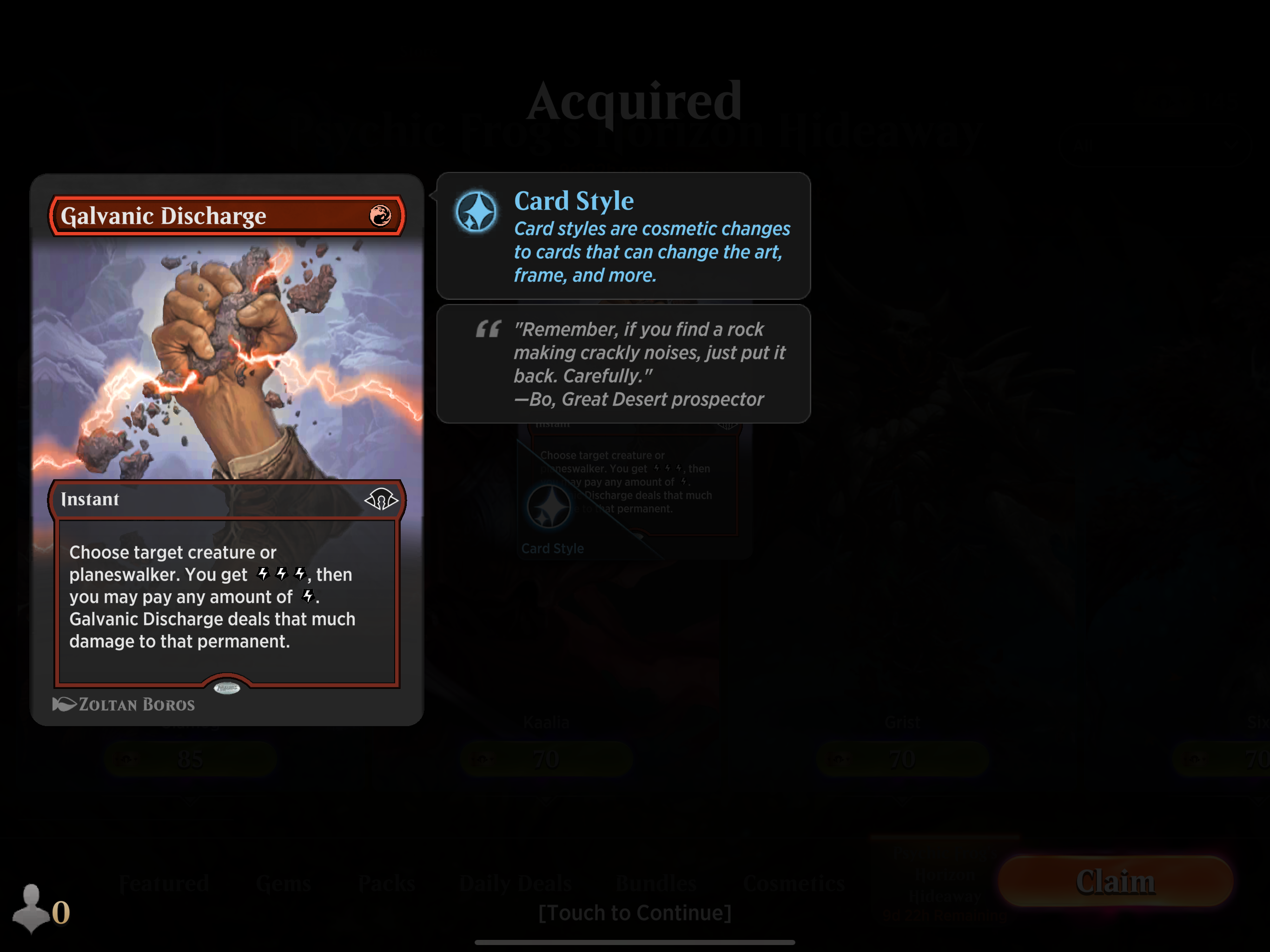 Creature나 Planeswalker를 선택해라. 너는 3개의 "번개"를 얻고, 너는 그 "번개"를 몇개든 쓸 수 있다. Galvanic dischare는 그 만큼의 데미지를 permanent에게 준다.