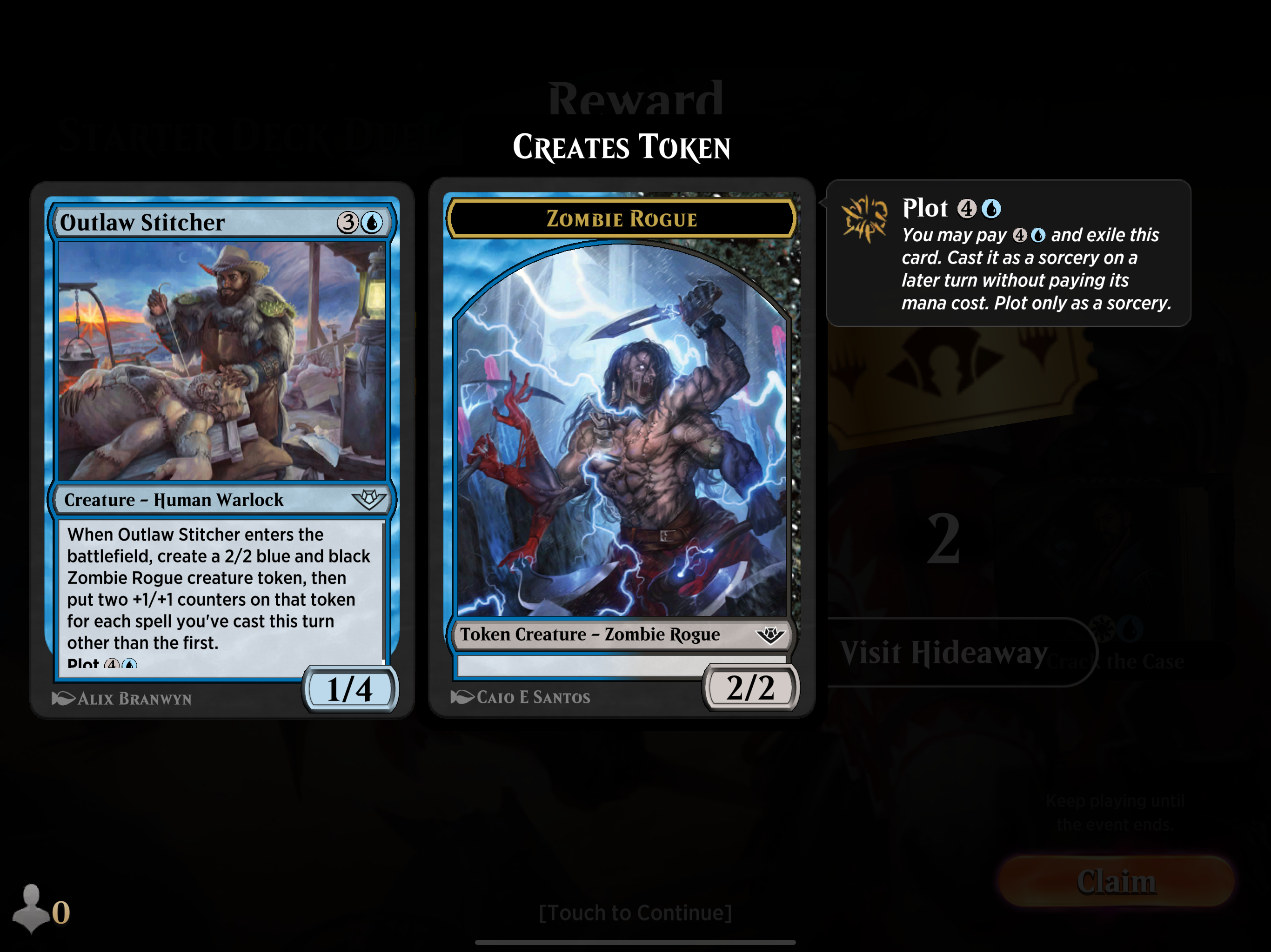 Outlaw Stitcher 가 Battle field 에 들어올 때, 2/2의 블루 블랙의 좀비 로그 생물 토큰을 만들고, 그리고 이번 턴에 1개의 spell 이후의 spell 마다 두개의 +1/+1 카운터를 갖는다.