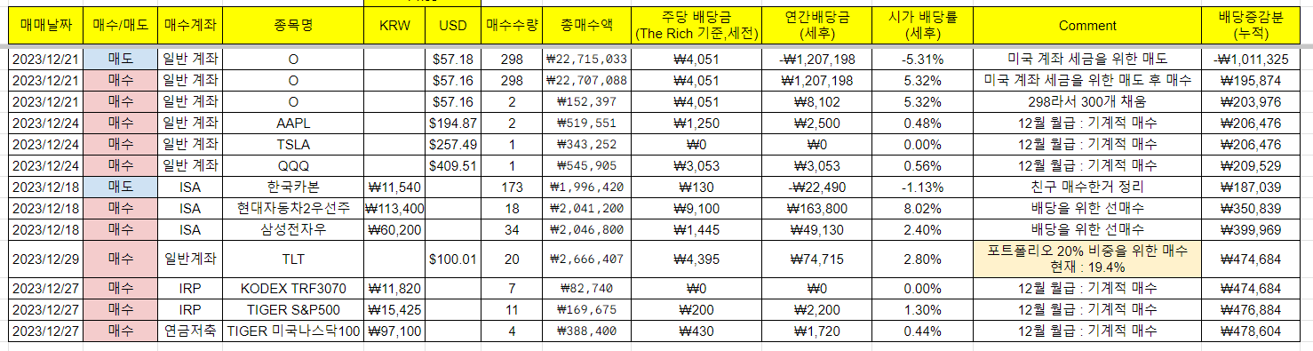그리고 작년에 수익난 것을 어설프게 팔아서 세금이 꽤 많이 나와서 올해는 꼭 미리 팔아서 250만원 이하로 만들고자 해서 생각난김에 12월 중순에 매도하고 바로 사서 세금을? 세이브하였습니다. 인생 아무도 모르지만 갑자기 다 팔아야할 상황이 나올 수 있기 때문입니다. 사실 내년에 큰 이벤트가 있기도 하고요....