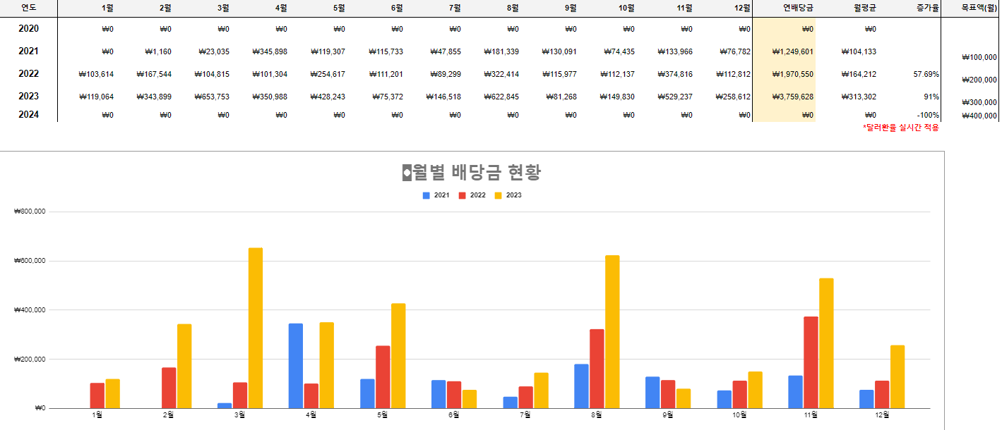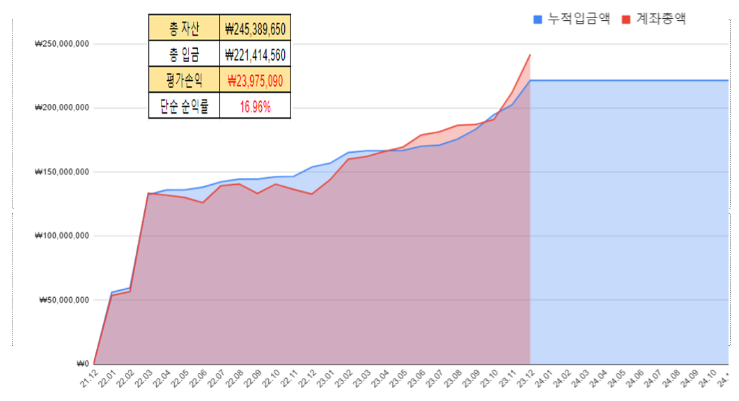 이번에는 2023년 12월 결산입니다. 개인 성과가 좋지 못해 예전 같지는 않지만, 연말 보너스도 나왔습니다. 게다가 DC 계좌의 투자액도 12월말에 들어오기 때문에 먼가? 기대되는 달입니다. 그리고 제가 투자한 1년을 둘러 볼 수있는 정리가 될 것 같아 벌써 기대가 됩니다. 사실 이미 알고 있지만 척해봤습니다.