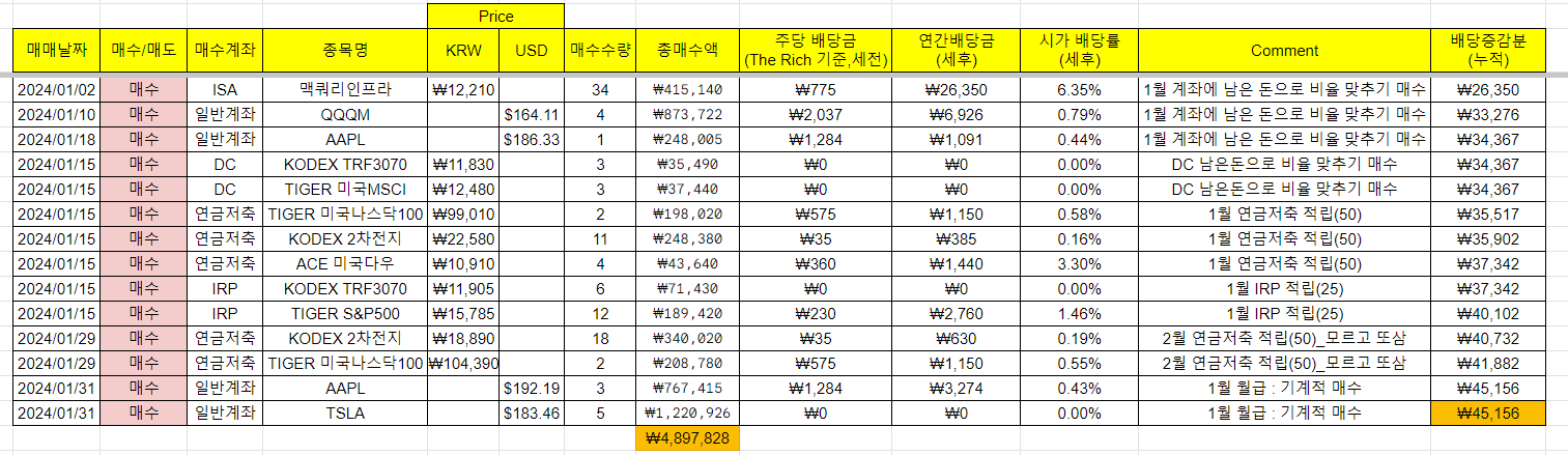 2024년도 1월에 주식 매수한 내용입니다. 월급이 500만원이 될까말까 하는데 어떻게 저렇게 살 수 있었는지 모르겠네요. 아마 통장에 있는 돈을 끌어 모았던 것 같습니다. 배당금 연말 보너스등이 좀 남았던 것 같네요. 그리고 코인도 샀으니깐 다음달부터는 코인란도 추가해야 할 거 같습니다. 나름 정리한 것 같은데도 아직도 백화점 같네요.