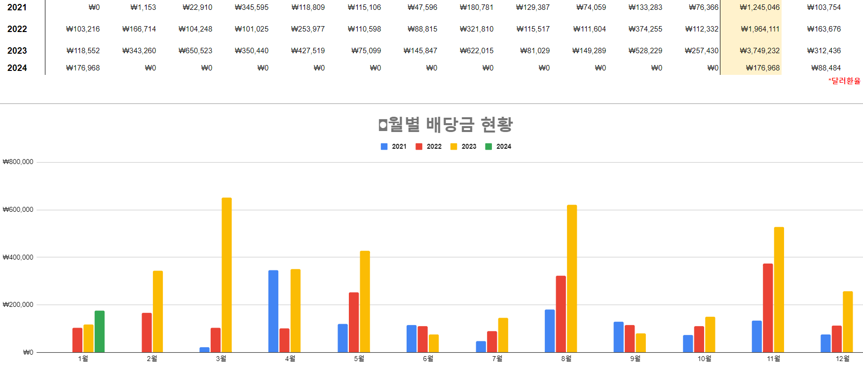 작년 1월 대비 49.2% 정도 올랐습니다. 매년 배당금을 받는 것이 늘어나니 기분이 정말 좋아지네요. 개인적으로 1월의 배당금이 낮아서 아쉬운데, 빨리 차곡차곡 모아서 월 배당 미니멈 20만원을 만들어야 할 것 같습니다. 일부러 1월달에 많이 받으려고 1월달에 배당을 주는 주식을 사진을 않겠지만, 빨리 매달 배당주는 애들을 더 모아야할 것 같습니다.