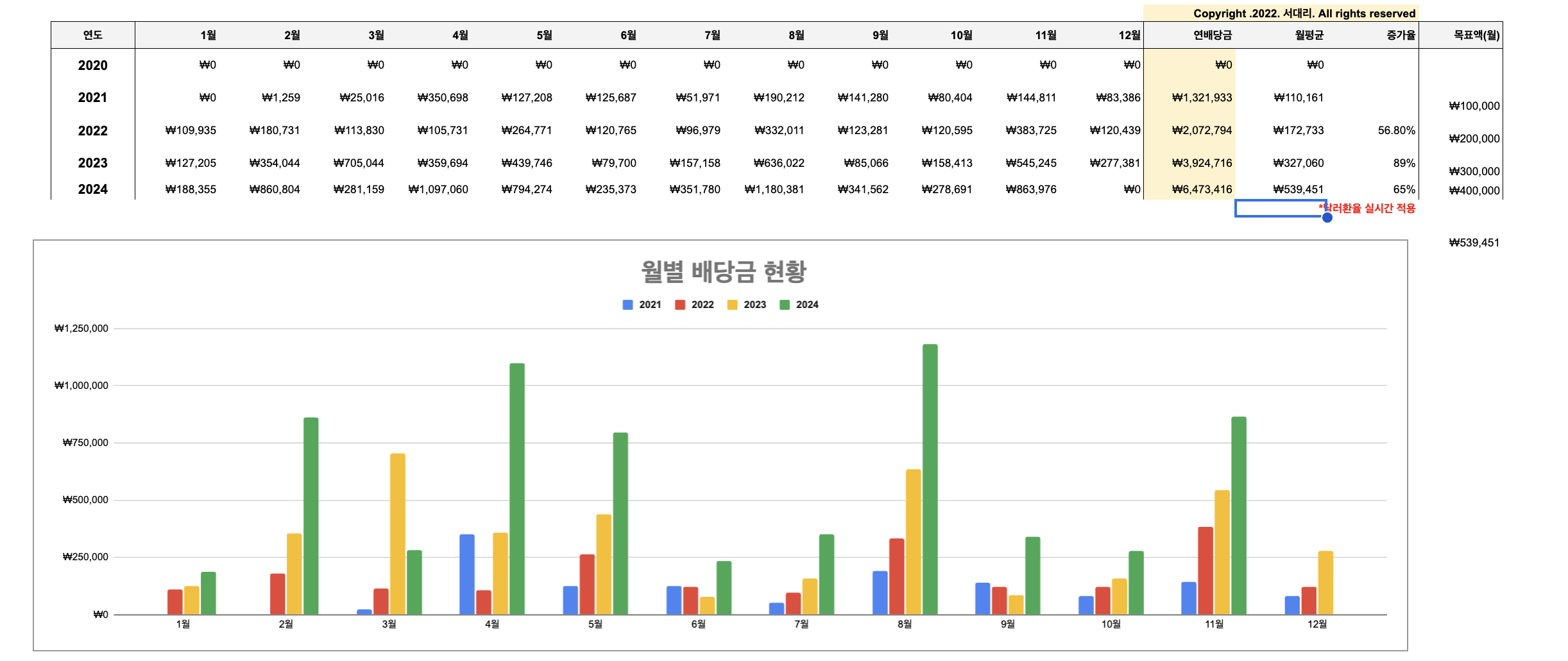 2024년의 11월달의 누적 배당금 증가분은 대략 월평균 7만원대입니다.