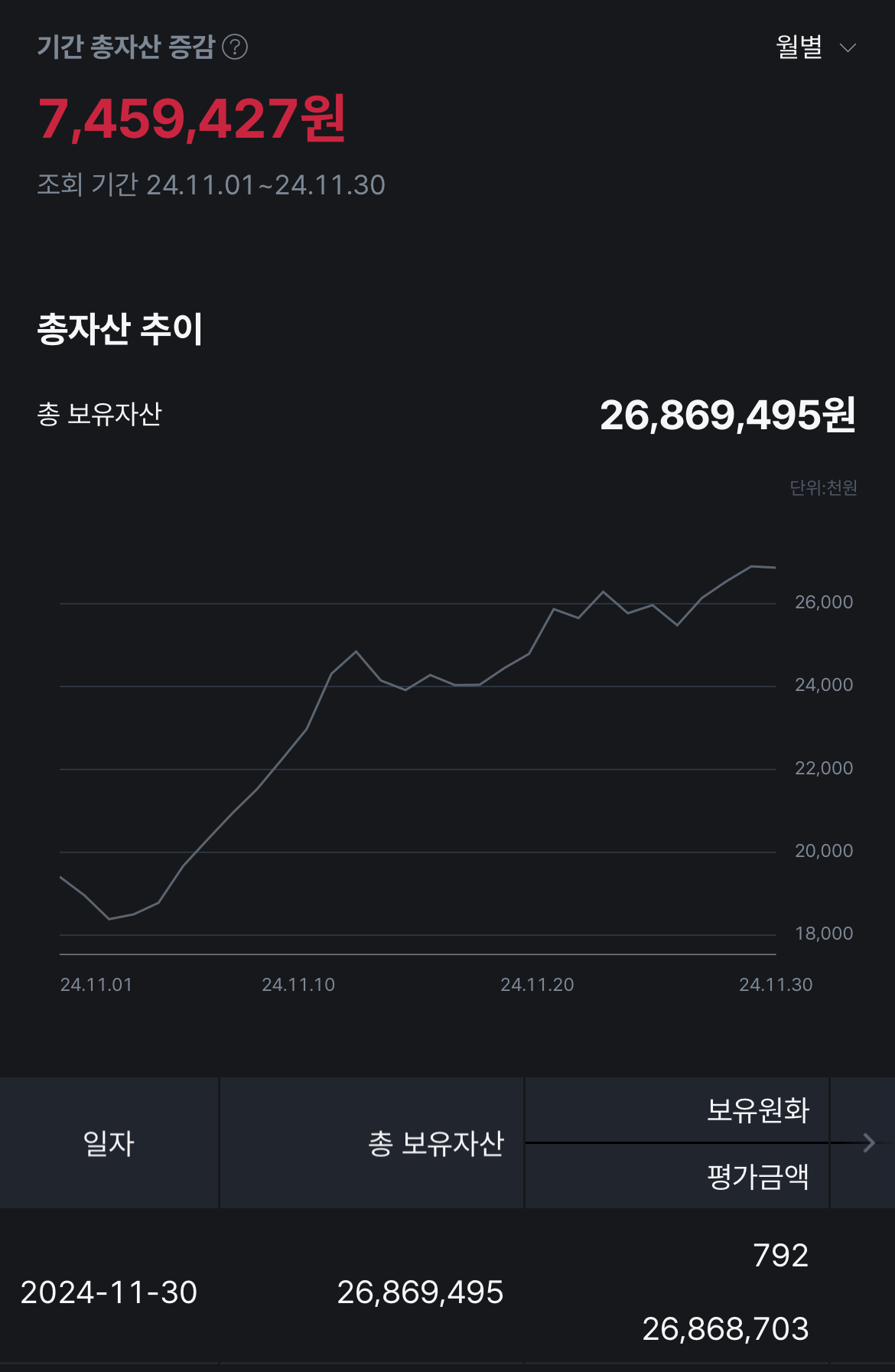 2024년의 11월달의 누적 배당금 증가분은 대략 월평균 7만원대입니다.