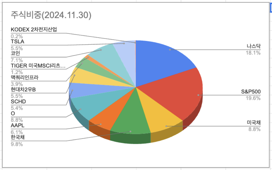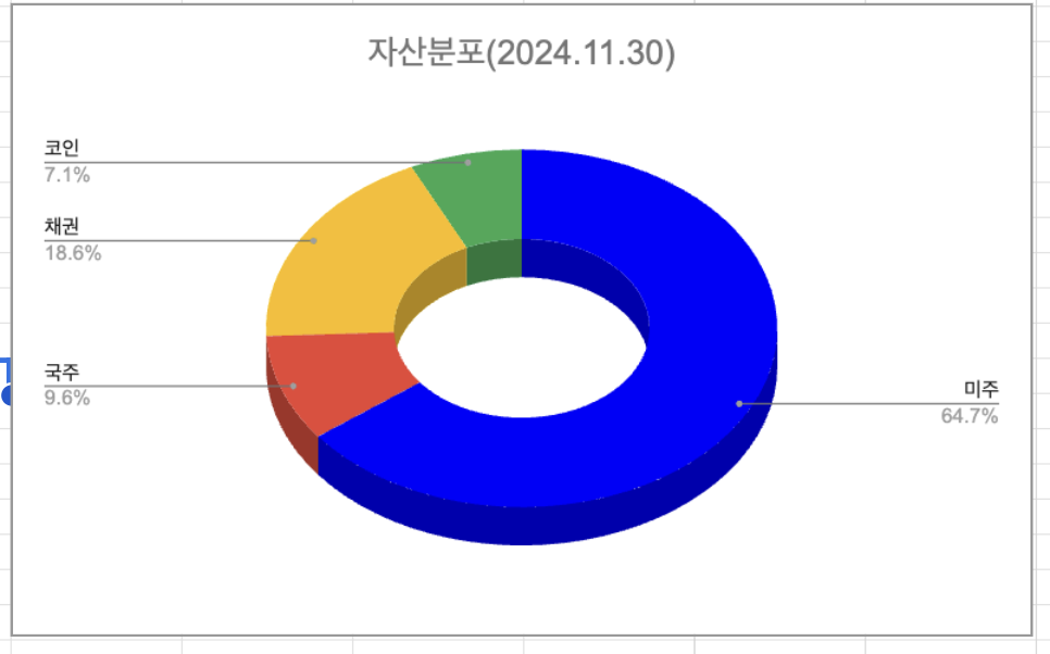 요즘 코인이 많이 올라 비중이 좀 올라갔는데, 금 현물을 정리하여 10% 목표도 많이 떨어졌고, 미국 채권이 떨어지고, 미주가 생각보다 많이 올라서 비중이 마음처럼 되지 않고 있습니다.