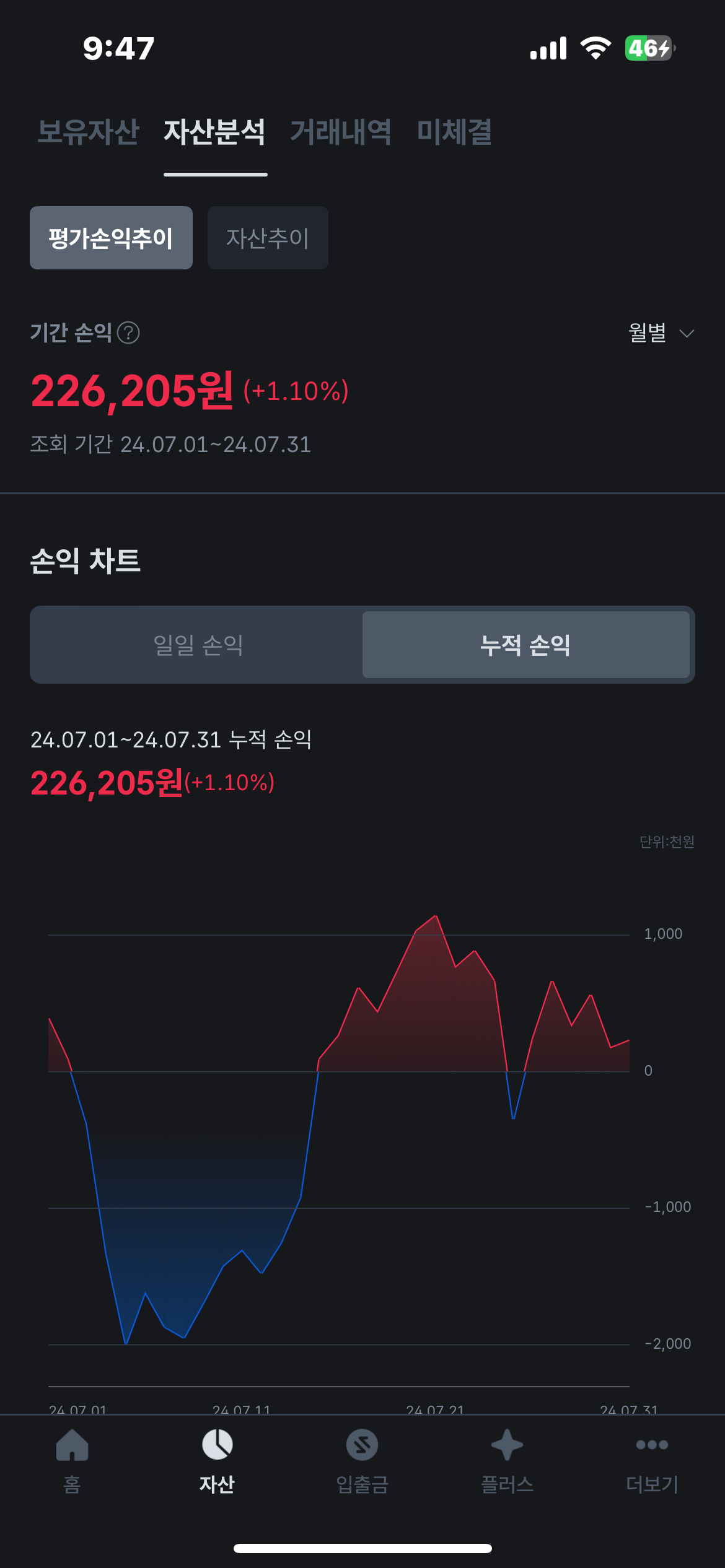 근데 신기한 것은 자산추이는 떨어졌는데? 기간 손익은 올랐네요?