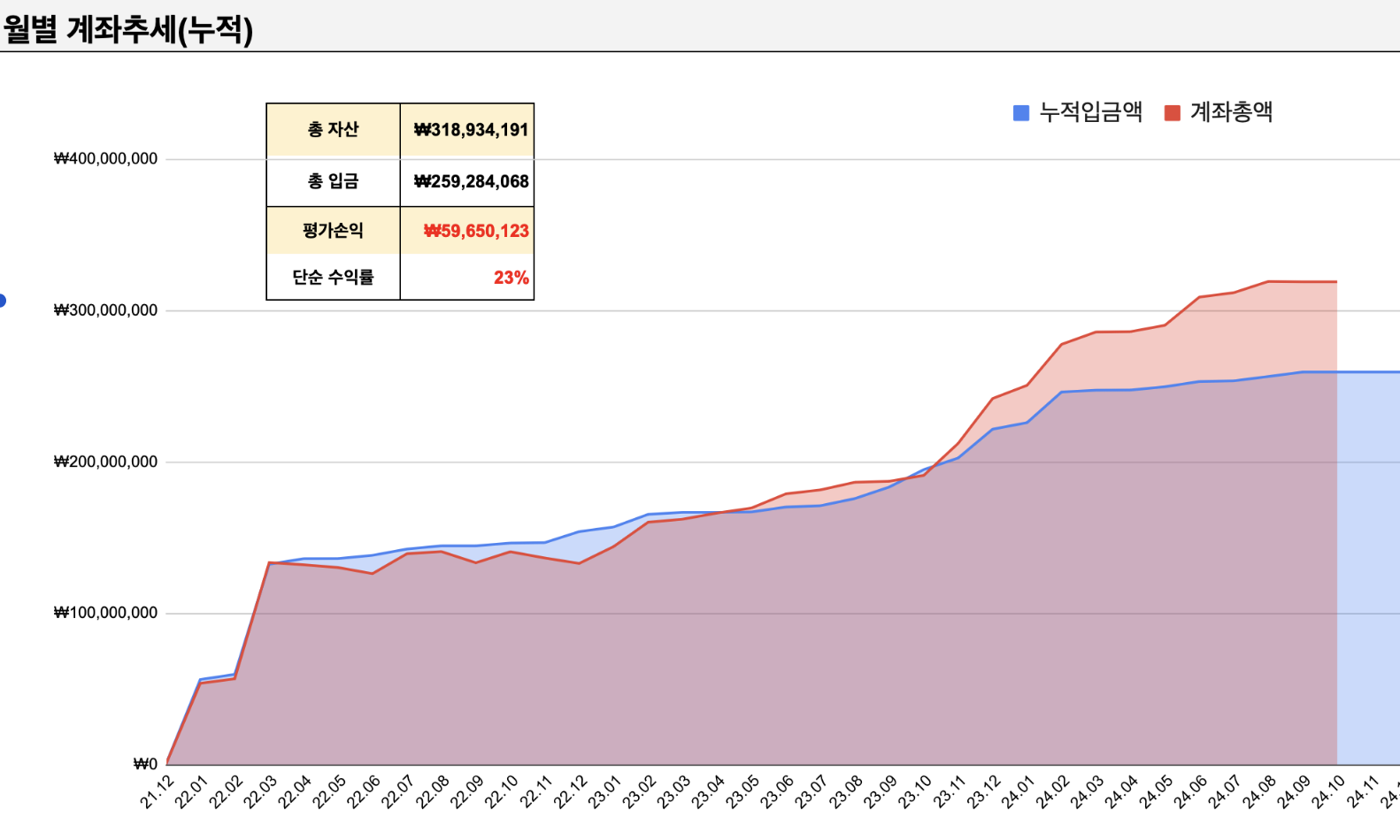 입금액과 자산의 갭이 조금씩 벌어지는 것을 보며, 언젠가 있을 떡락장에 버틸수 있는 시간이 조금 길지 않을까 생각이 듭니다.
