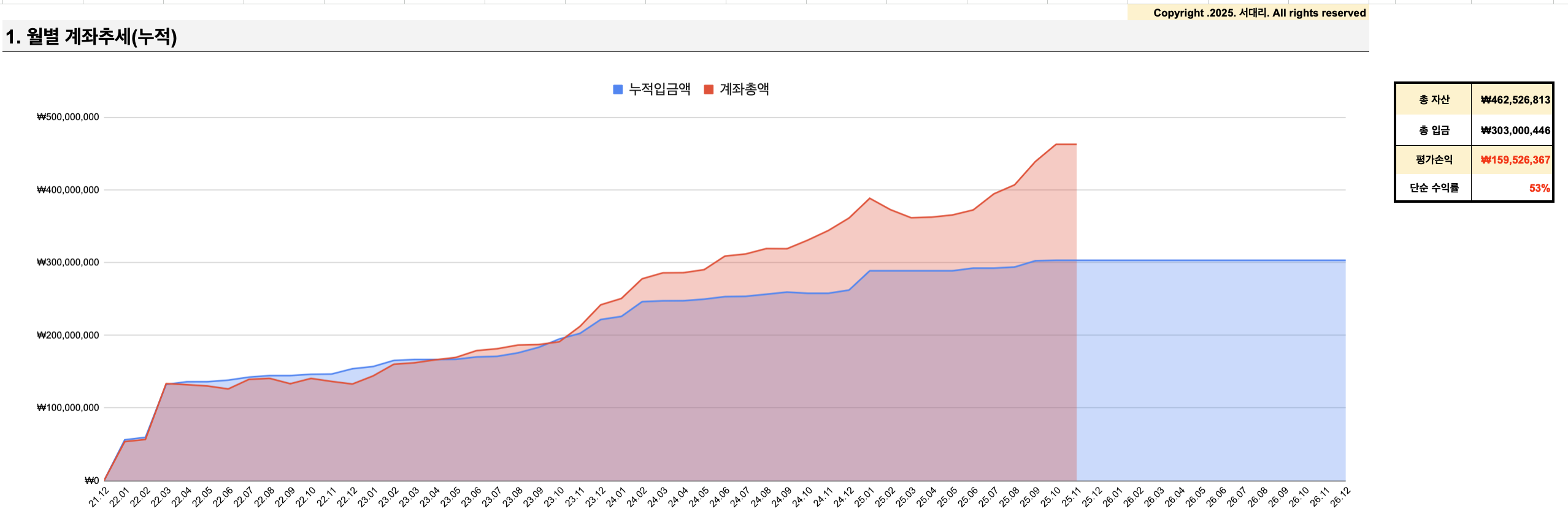 누적 투자금액은 3억 300만원이었으니, 평가손익은 1억 5,962만원으로 약 53%의 수익률을 기록하고 있습니다.