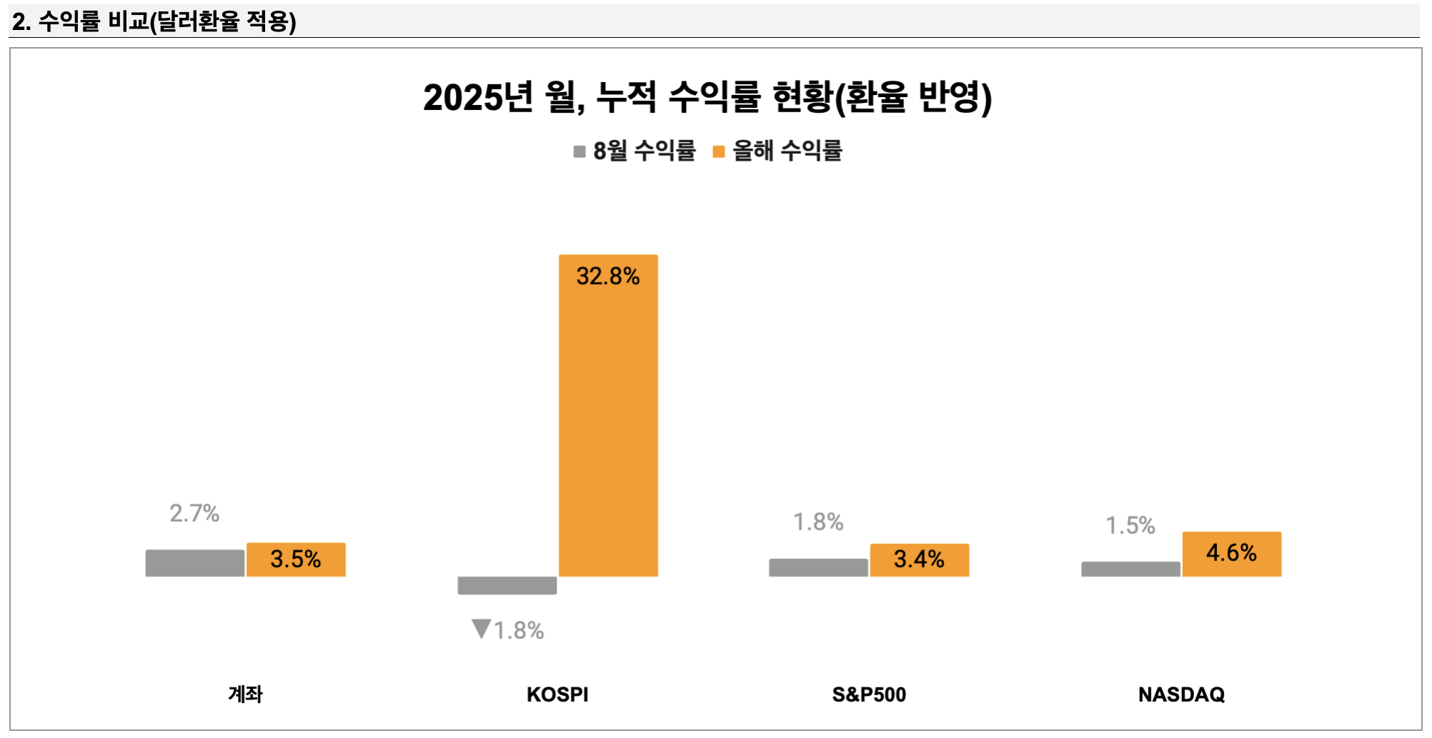 8월 한 달 동안 계좌별 수익률은 계좌가 2.7%, KOSPI가 -1.8%, S&P500이 1.9%, NASDAQ이 1.6%였습니다. 누적 기준으로는 올해 들어 계좌가 3.5%, KOSPI가 32.8%, S&P500이 9.8%, NASDAQ이 11.1%의 성과를 보였습니다. 올해 KOSPIrk 32.8%나 올랐다는게 놀랍습니다. 하지만 장기적 관점에서는 글로벌 분산 투자가맞다고 생각하니깐, 큰 틀에서는 만족하고 있습니다.