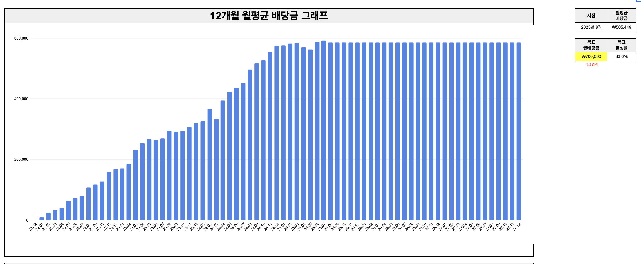 8월 기준 12개월 월평균 배당금이 59만으로 집계되었습니다. 목표 월배당금 70만원에는 아직 미치지 못하지만, 꾸준히 증가하는 추세입니다. 올해 말에 정말 70만원이 될 수 있을지는 저도 궁금합니다.