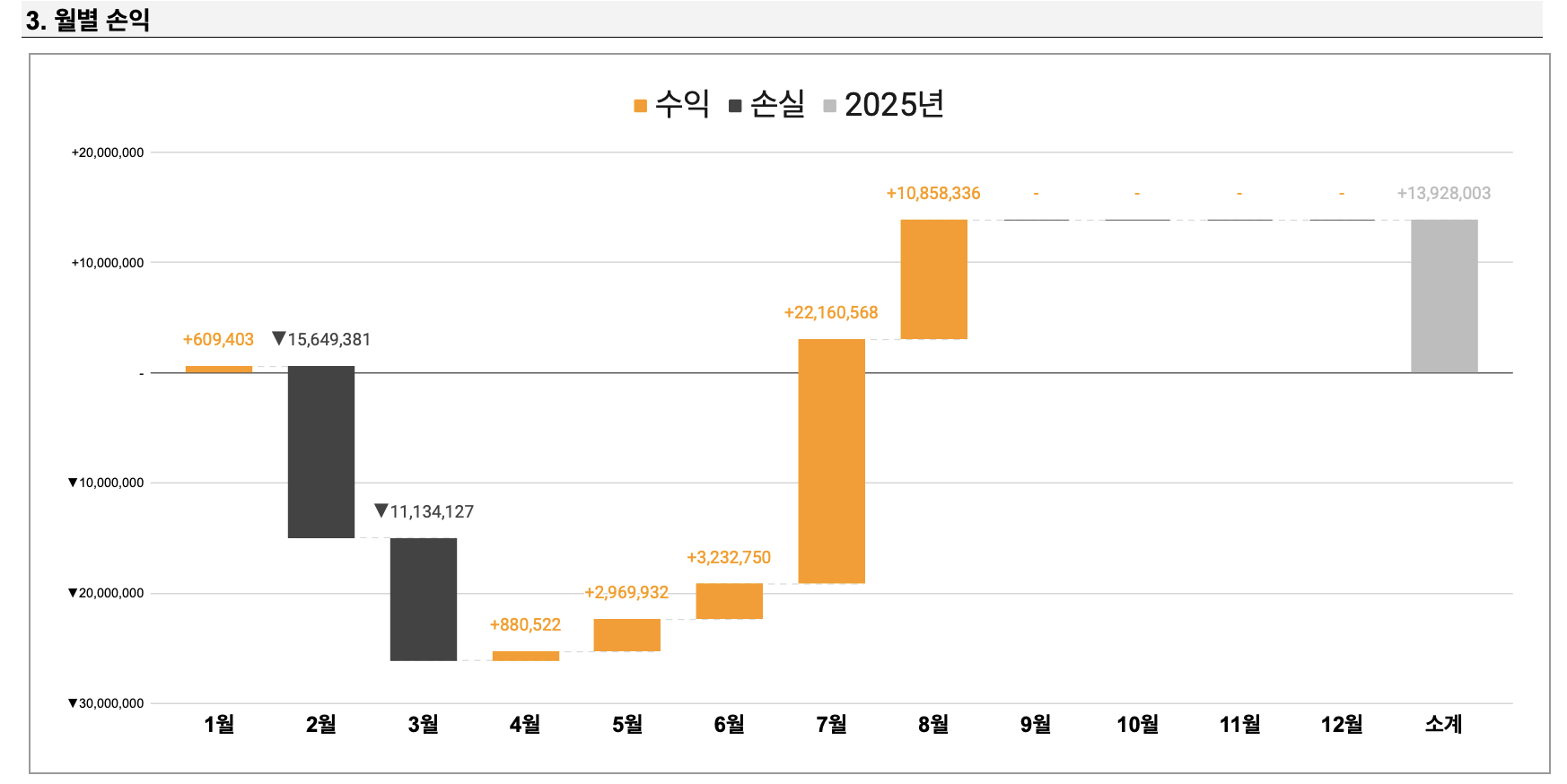 2025년 월별 손익을 보면 흥미로운 패턴이 보입니다. 2월과 3월에 각각 1,564만원과 1,113만원의 손실을 기록했지만, 4월부터 5월까지는 꾸준한 수익을 냈고, 8월에는 1,085만원의 큰 수익을 거두었습니다. 2-3월 급락장이 정말 힘들었는데, 그때 손절하지 않고 버틴 게 결국 좋은 결과로 이어졌네요. 역시 투자에서 가장 중요한 건 인내심인 것 같습니다.