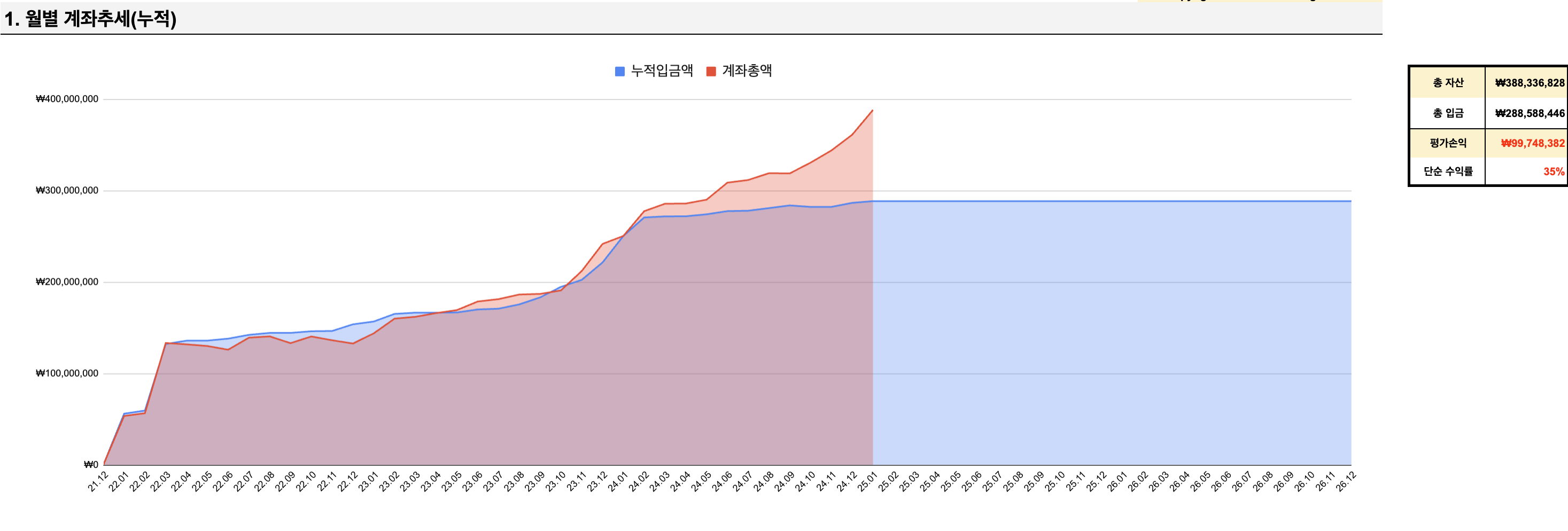 누적 투자금액은 2억 9,375만원이었으니, 평가손익은 1억 1,306만원으로 약 38%의 수익률을 기록하고 있습니다.