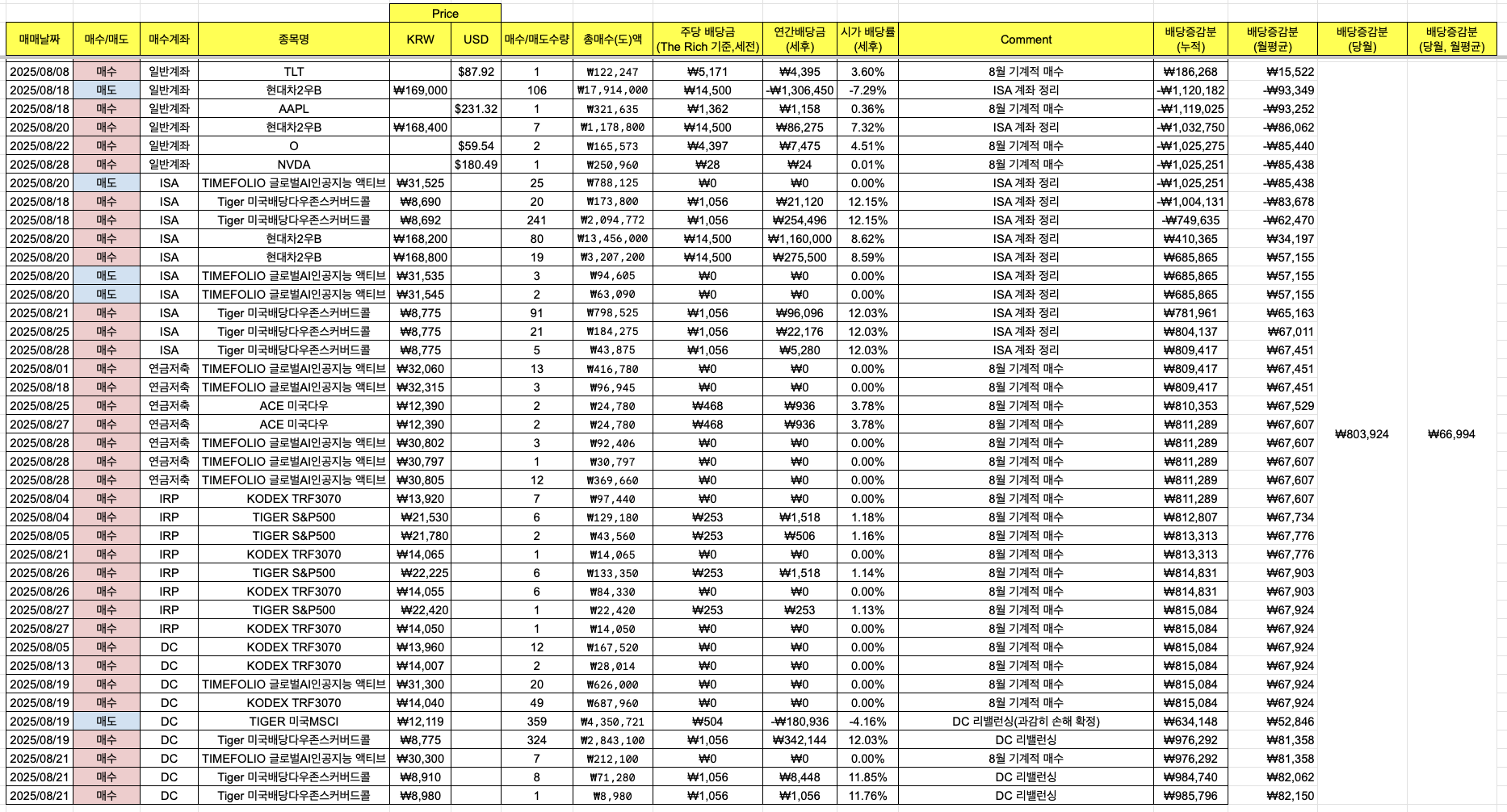 8월 한 달간의 거래 내역을 보면 상당히 활발했습니다. 주요 매수 활동은 다음과 같았습니다